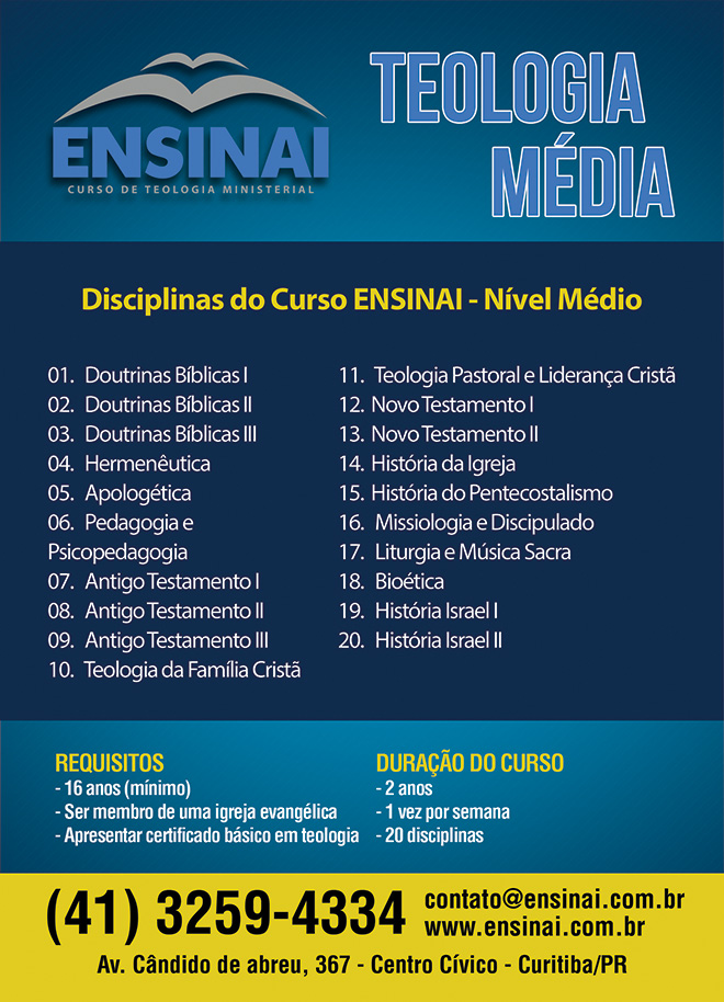 Documento de Conclusão do Curso: Tendo sido aprovado nas 20 matérias deste curso, o aluno estará apto a receber o Certificado de Teologia Média de Teologia.